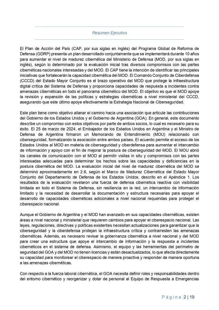 El 9 de octubre de 2024 se presentó el PAP luego del relevamiento efectuado por el experto estadounidense a los organismos militares del sector ciber y determinado el nivel de actualización, capacitación y respuesta cibernética con el objetivo de mejorar la postura de ciberseguridad del sistema de Defensa.