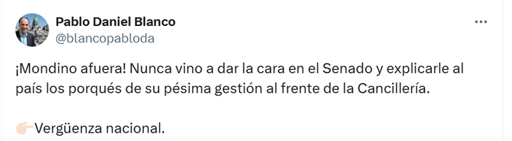 El senador radical por Tierra del Fuego, Pablo Blanco, calificó la gestión de Mondino como "vergüenza nacional". Él fue muy criticó de la política de la Cancillería sobre el reclamo de la soberanía de las Islas Malvinas. "Nunca vino a dar la cara en el Senado y explicarle al país los porqués de su pésima gestión al frente de la Cancillería", escribió en su cuenta de X.