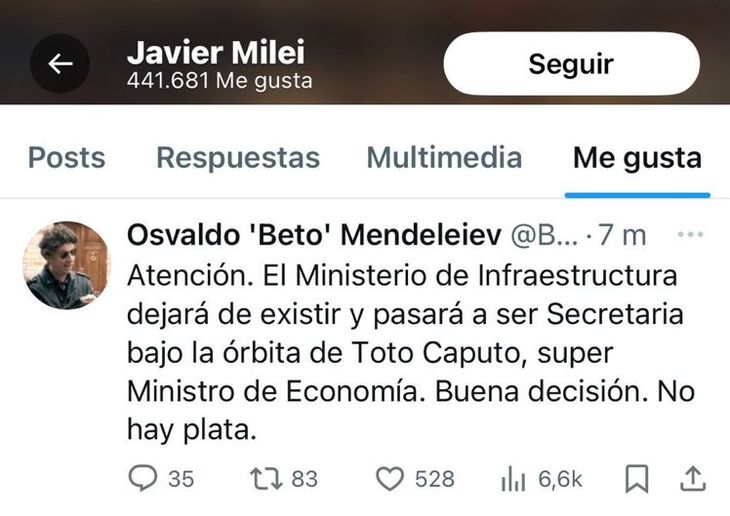 Si bien desde el oficialismo ningún funcionario se pronunció públicamente sobre el tema, el propio Javier Milei le dio "me gusta" a una publicación en la red social X, que celebraba el pase a Secretaría de Infraestructura bajo el argumento "no hay plata".