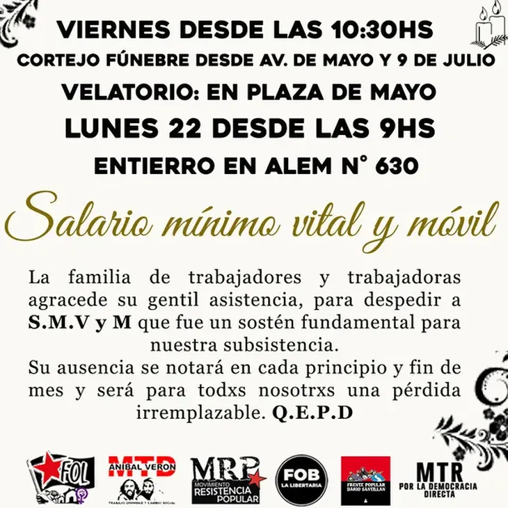 La protesta hasta incluyó la publicación de un aviso fúnebre: "Familiares y trabajadores de todo el país damos a conocer con profunda tristeza el fallecimiento del SMVM", dice el texto, en referencia al salario mínimo.
