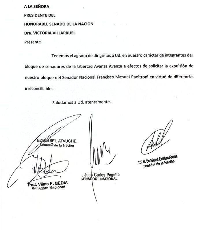 "Tenemos el agrado de dirigirnos a Ud. en nuestro carácter de integrantes del bloque de senadores de la Libertad Avanza Avanza a efectos de solicitar la expulsión de nuestro bloque del Senador Nacional Francisco Manuel Paoltroni en virtud de diferencias irreconciliables", expresaron a en el pedido elevado ante la vicepresidenta Victoria Villarruel. El documento fue firmado por cuatro de los seis integrantes del bloque, aunque los otros dos también habrían acordado con el texto a través de su correo electrónico.