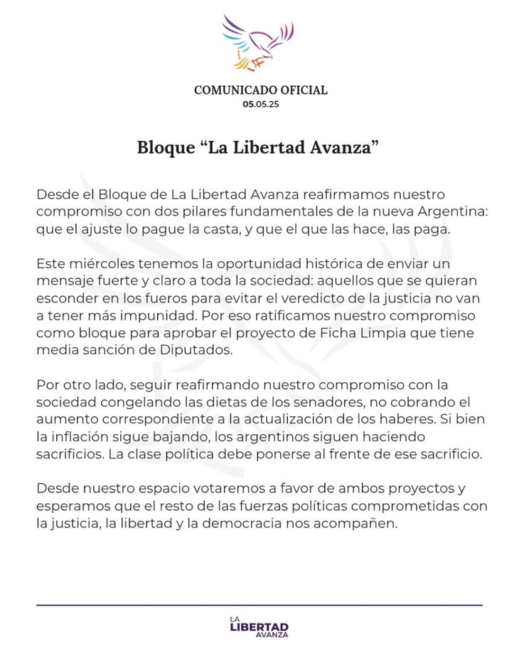 “Los libertarios no quieren que salga Ficha Limpia”. Palabras más, palabras menos, esa es la sensación que tienen, desde hace semanas, los senadores de los diferentes bloques. El comunicado que sacó la bancada de La Libertad Avanza (LLA) encendió las alarmas de la oposición, al filo de la sesión para avanzar con la iniciativa que de ser ley le impediría participar en los comicios nacionales a Cristina Kirchner, quien está condenada en segunda instancia en la causa Vialidad.