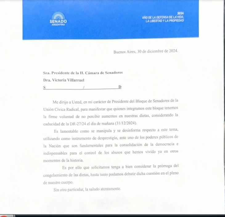 "Me dirijo a usted, en mi carácter de presidente del bloque de senadores de la Unión Cívica Radical, para manifestar que quienes integramos este bloque tenemos la firme voluntad de no percibir aumentos en nuestras dietas, considerando la caducidad de la DR-27/24 el día de mañana (31/12/2024)", precisó el titular del bloque radical.