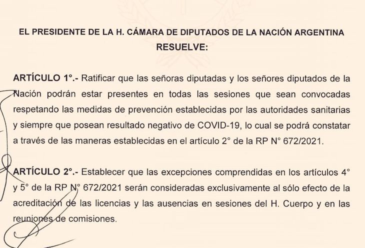 A través de la resolución, Massa ratificó que "las señoras diputadas y los señores diputados de la Nación podrán estar presentes en todas las sesiones que sean convocadas respetando las medidas de prevención establecidas por las autoridades sanitarias y siempre que posean resultado negativo de COVID-19".