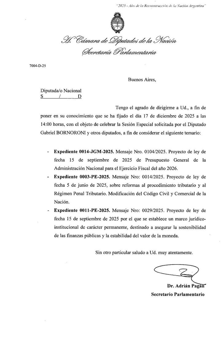 La Cámara de Diputados confirmó la citación para el próximo miércoles para llevar a cabo la primera sesión del período de sesiones extraordinarias. El temario prevé que se debatan en el recinto los proyectos de Presupuesto 2026, la ley de Inocencia Fiscal y la ley de Compromiso Nacional por la Estabilidad Fiscal y Monetaria.
