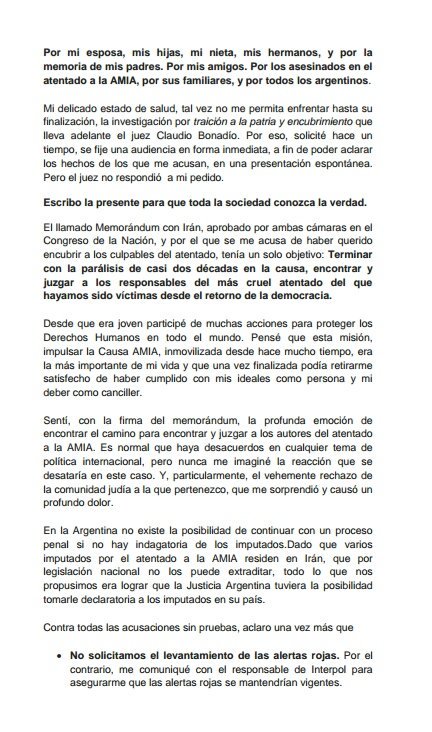 El ex canciller explicó en el inicio de su carta de dos páginas que se vio impulsado a escribirla por su esposa, sus hijas, sus nietas, la memoria de sus padres, por sus amigos y por "los asesinados en el atentado a la AMIA, por sus familiares, y por todos los argentinos".
