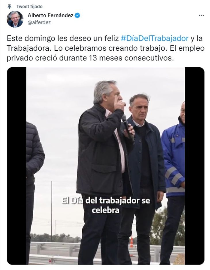 El presidente Alberto Fernández publicó un mensaje en su cuenta oficial de Twitter, en un hilo de tuits donde hizo énfasis en la recuperación económica de los últimos meses. En un video que acompaña la publicación, el mandatario expresó: “Este domingo les deseo un feliz #DíaDelTrabajador y la Trabajadora. Lo celebramos creando trabajo. El empleo privado creció durante 13 meses consecutivos”.
