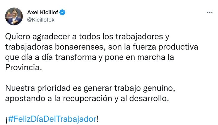 El gobernador de la provincia de Buenos Aires, Axel Kicillof, también expresó palabras emotivas desde su cuenta de Twitter. "Son la fuerza productiva que día a día transforma", dedicó en su tuit a los trabajadores.