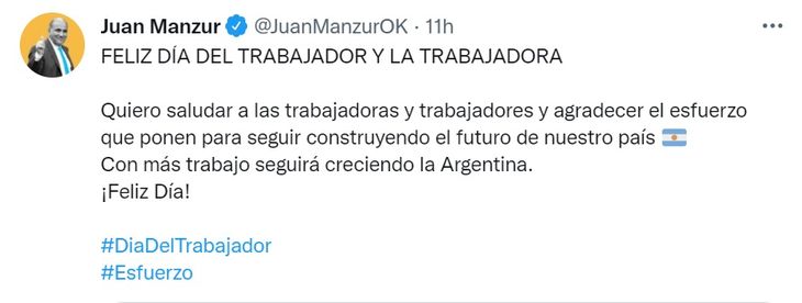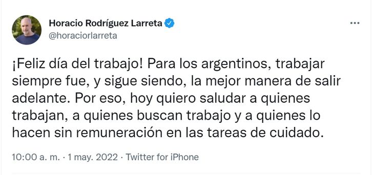 Otro que acompañó con su mensaje en este 1° de Mayo fue el Jefe de Gobierno de la Ciudad de Buenos Aires, Horacio Rodríguez Larreta, quien tuiteó hoy. "Trabajar siempre fue, y sigue siendo, la mejor manera de salir adelante", expresó hoy en las redes.