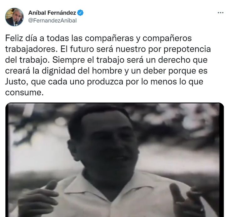 Quienes no se perdieron la chance para saludar y además dejar un mensaje en clave política fueron dos “pesos pesados”. Por un lado el ministro de Seguridad, Aníbal Fernández, quien publicó las palabras del último discurso de Eva Perón, del 1° de mayo de 1952. Junto al tuit, un video de Juan Domingo Perón hablando sobre el trabajo.