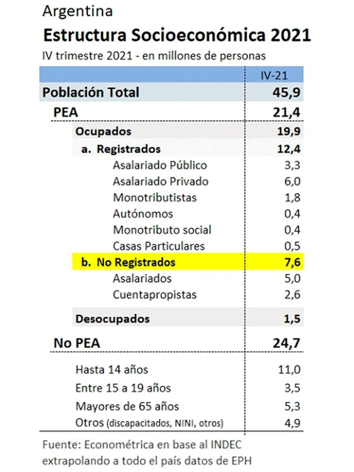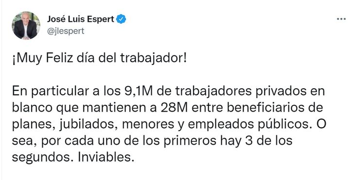 Por otra parte, el diputado de Avanza Libertad, José Luis Espert, hizo un saludo especial por el Día del Trabajador 2022: recordó a "los trabajadores privados" que mantienen a "28 millones de beneficiarios de planes". Publicó un cuadro con datos sobre la situación de los trabajadores retirados en Argentina al día de hoy, como cuestionamiento al rumbo económico del Gobierno.