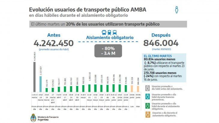 A la vez, el total expone una reducción del 80 % frente a los 4.242.450 pasajeros que utilizaron los tres medios de transporte, en promedio, en días hábiles previos al aislamiento.