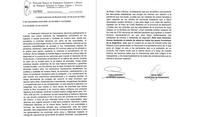 En el texto, que lleva la firma de los dos representante de la Federación, se señaló que los conductores son demorados "durante largas horas, incluso jornadas enteras, mientras se los mantiene imposibilitados de acceder a sus necesidades básicas de alimentos, sanitarios y aseo personal".