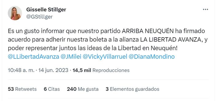 El punto de quiebre absoluto en la relación se dio cuando Eguía se enteró por Twitter que el líder liberal había sellado una alianza con Arriba Neuquén, un partido local que tiene como presidenta a Gisselle Stillger, la hermana del actual concejal del PRO en la capital, Denisse Stilleger.
