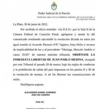 "Ordénese la inmediata libertad de Juan Pablo Medina, bajo las reglas de conductas y la prohibición de salida del país impuestas en la resolución de mentas. A tal fin líbrense las comunicaciones de estilo", dispuso el juez Alejandro Daniel Esmoris.