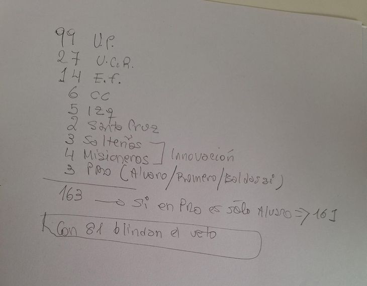 Ámbito tuvo acceso al poroteo opositor que arrojaba anoche entre 161 y 163 votos en contra del veto, es decir a favor de la insistencia de la ley, de cara a la sesión en Diputados: 99 votos de Unión por la Patria, 27 de la UCR, 14 de Encuentro Federal, 6 de la Coalición Civica, 5 del frente de izquierda, 2 de la provincia de Santa Cruz, 3 salteños, 4 misioneros, 2 del PRO. Los legisladores de Salta y Misiones pertenecen a Innovación Federal, bloque que se abstuvo en la votación del veto a la movilidad jubilatoria pero que ahora, ante el incumplimiento de los acuerdo de Nación con los gobernadores Gustavo Sáenz y Hugo Passalacqua, votarían en contra del veto a las universidades.