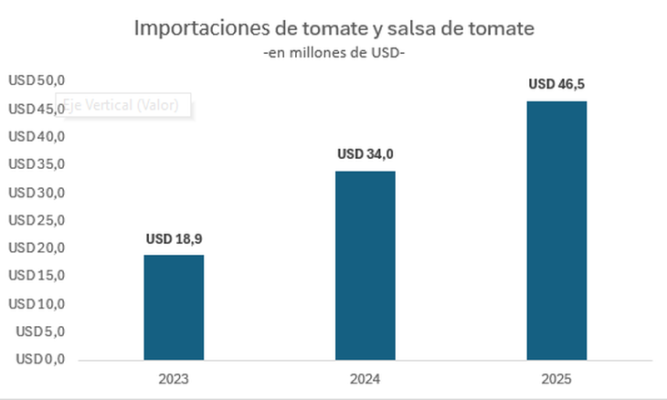 Los datos del INDEC respaldan este sombrío panorama. En 2025 la suma de las importaciones de tomate, salsa de tomate, duraznos y jugo de durazno fue 40,9% mayor que la de 2024 y casi 150% superior a la de 2023. En el mismo sentido, un reciente informe de la consultora Equilibra mostró que, entre enero y octubre del año pasado, las compras al exterior de tomate fueron 357% mayores a las del promedio histórico de las últimas dos décadas. La mayor parte de estos productos proviene de Chile, aunque en el caso del tomate también resalta la creciente entrada desde China.