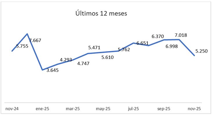 En la comparación mensual, el retroceso fue aún más marcado. Respecto de octubre, cuando se habían contabilizado 7.018 escrituras, los actos disminuyeron un 25,2%, reflejando un freno en la dinámica de cierres hacia el tramo final del año. Aun así, el valor promedio por operación continuó en alza: el monto medio de las escrituras se ubicó en $168.759.187, equivalente a unos u$s 115.718 al tipo de cambio oficial promedio. En términos interanuales, este valor creció 66,1% en pesos y 16,3% medido en moneda estadounidense.
