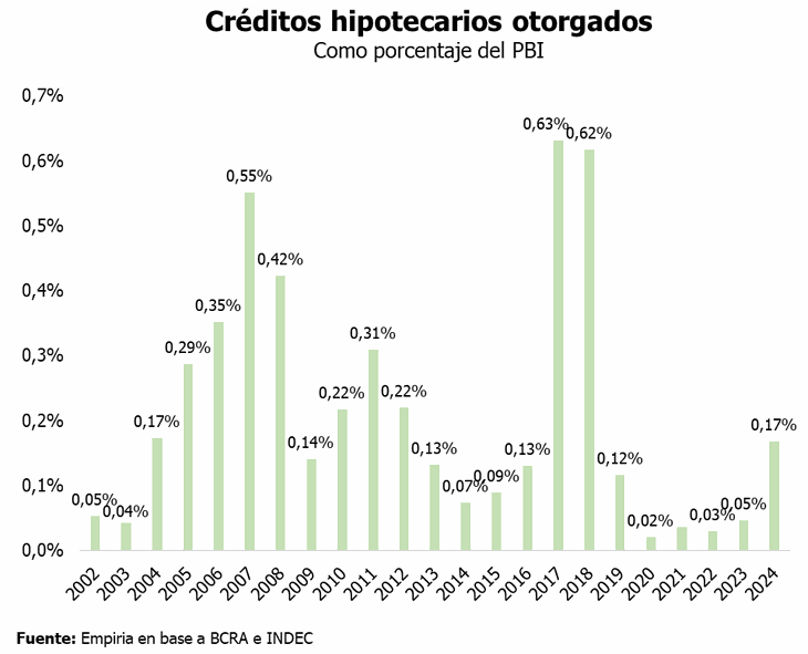Tras la fuerte suba en la demanda de los créditos hipotecarios, las entidades bancarias aumentaron la Tasa Nominal Anual (TNA), con la intención de "moderar" las tomas de préstamos. A principios de octubre, la tasa de interés promedio de los créditos hipotecarios era de 4,3% para los bancos públicos o provinciales y 5,6% para los bancos privados de alcance nacional, mientras que actualmente ascienden a 4,9% y 6,8%, respectivamente. "Esto significa un aumento de la cuota inicial (y del ingreso requerido) del 20% en un crédito a 25 años", explica el economista Federico González Rouco, de Empiria Consultores, en X.