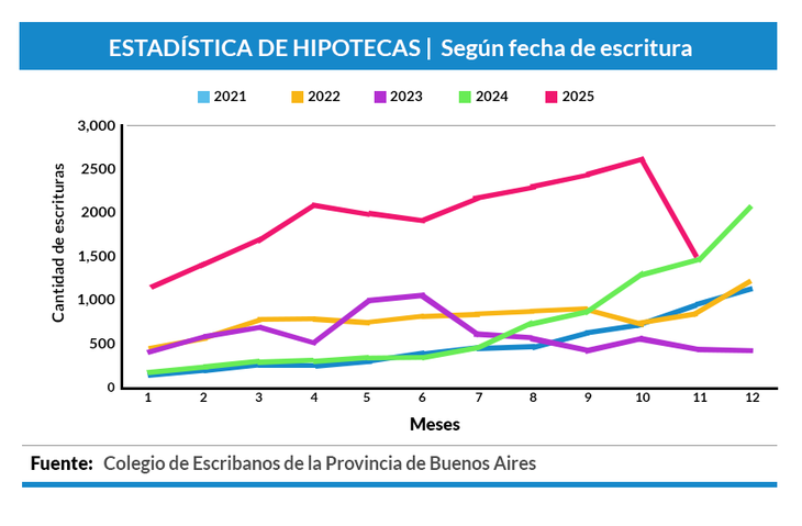 El retroceso de noviembre respondió, en gran parte, al punto de partida excepcional. Octubre concentró un volumen inédito de operaciones, impulsado por el repunte del crédito hipotecario, que alcanzó 2.600 actos, con una suba interanual del 99%. Ese empuje permitió que el acumulado anual superara las 115.000 escrituras hasta ese mes.