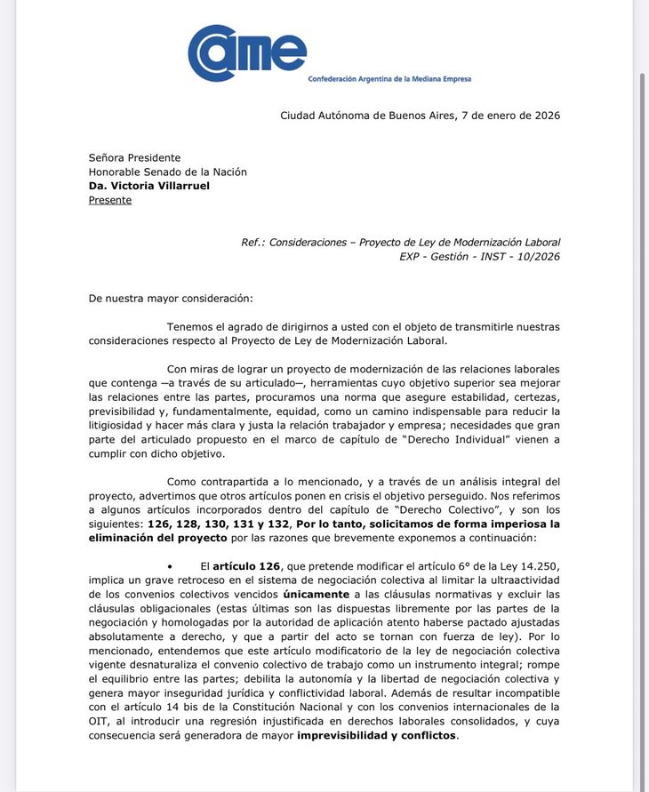 Donde las objeciones se vuelven más explícitas es en el universo pyme. Tanto la Confederación Argentina de la Mediana Empresa (CAME) como ADIMRA acompañan el objetivo general de modernización y reducción de la litigiosidad, pero advierten que el capítulo de "Derecho Colectivo" introduce riesgos que van en sentido contrario.
