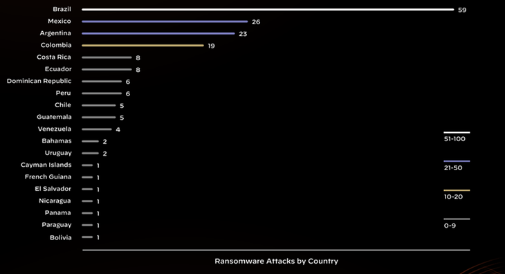 En total, hubo 180 ataques a empresas de los 20 países analizados. Durante 2022, se registraron 59 ataques en Brasil, 26 en México, 23 en Argentina, 19 en Colombia y 5 en Chile. En 2021, la cifra había sido considerablemente menor: 39 ataques en Brasil, 23 en México, 14 en Perú, 12 en Argentina y 10 en Chile.