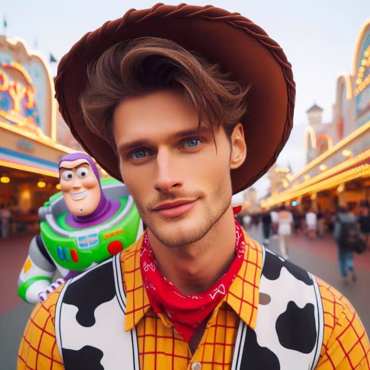 Esta última imagen es la que parece más real. Woody es un joven que está vestido con las prendas características del vaquero. Pareciera que se encuentra ubicado en un parque de diversiones y de fondo se puede ver a Buzz Lightyear, su compañero de aventuras.
