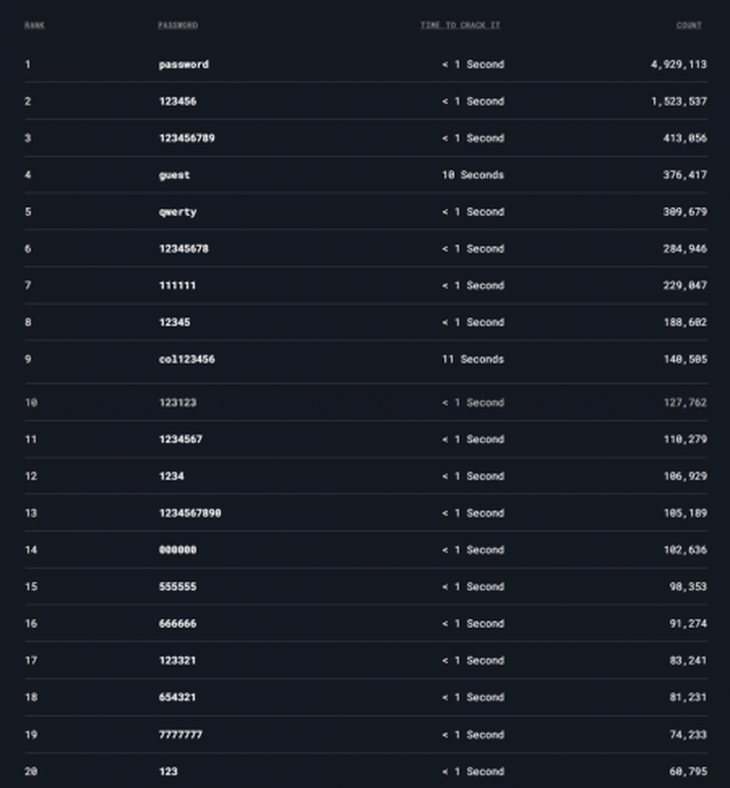 La tabla se ordenó acorde a la cantidad de veces que una misma clave se fue utilizada, incluye el número de veces que estaba presente en la base de datos, y el tiempo en que tardaría en ser descifrada a través de un ataque de fuerza . Esta vez, a diferencia de lo que venía sucediendo, “123456” ya no es la más utilizada, sino que su lugar lo ocupó otra contraseña que constantemente dice presente en este reporte: “password”.