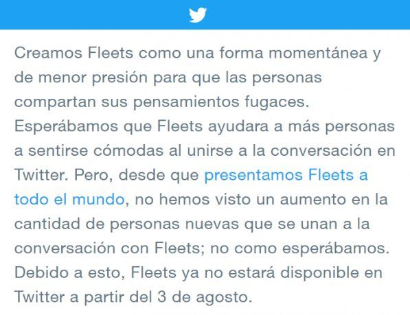 "No hemos visto el incremento que esperábamos en el número de nuevas personas que se unen a la conversación a través de Fleets", dice el comunicado. Twitter afirmó que este formato buscaba "abordar algunas de las ansiedades que frenaban a la gente a la hora de tuitear", pero que finalmente se han utilizado más por los usuarios que querían "amplificar sus tweets".