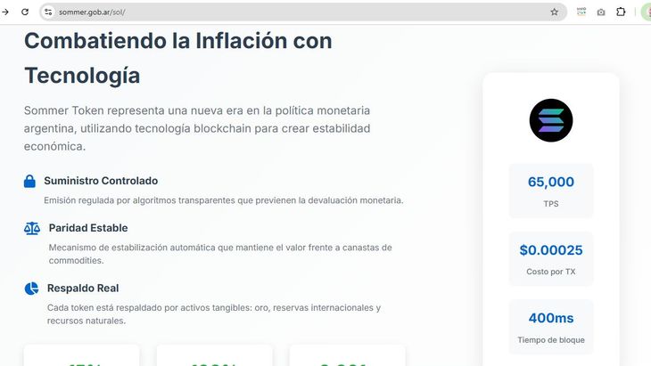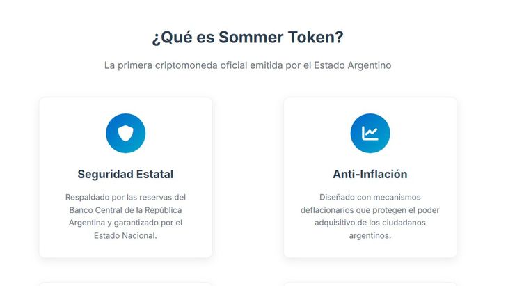 "Sommer Token es la primera criptomoneda oficial del Estado Argentino, construida sobre la blockchain de Solana. Es un token SPL que combina la estabilidad gubernamental con la eficiencia de la tecnología blockchain más avanzada. Cada token está respaldado por reservas del Banco Central y activos soberanos del país", define la web.