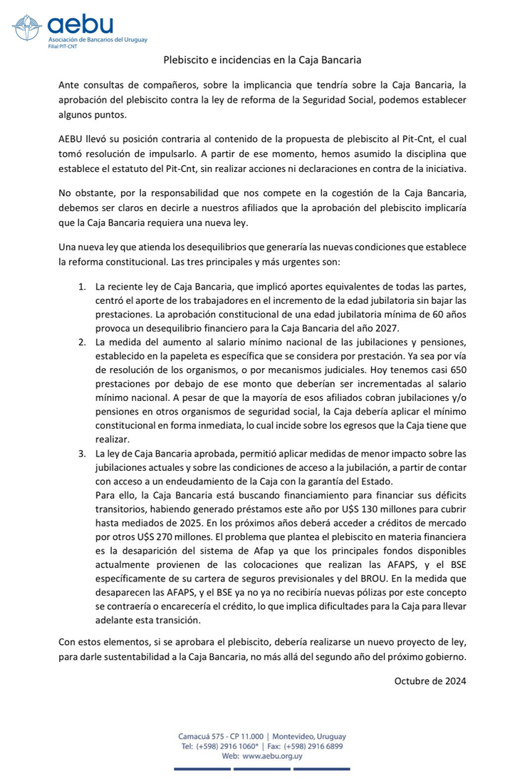 La Asociación de Bancarios del Uruguay (AEBU) presentó en un comunicado oficial las consecuencias que tendría la aprobación del plebiscito del PIT-CTN y aseguró que, en caso de aprobarse, debería presentarse una nueva ley para poder financiar la Caja Bancaria.