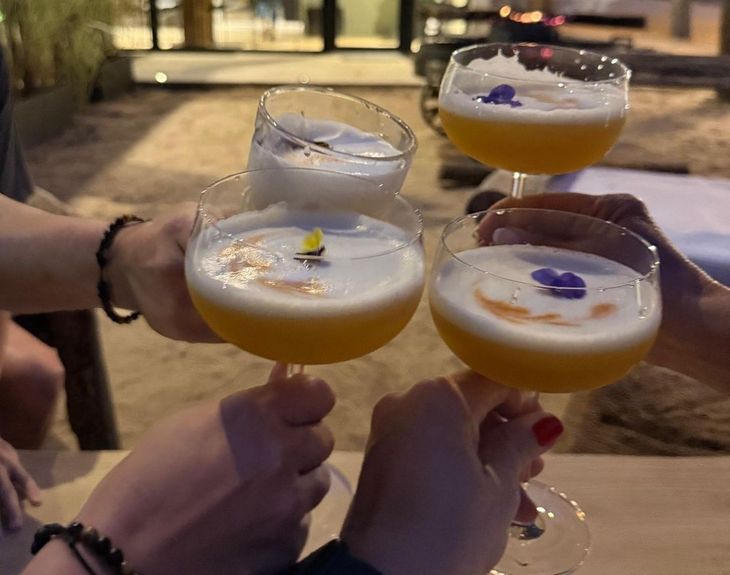 El espacio está organizado en tres sectores que funcionan como escenarios diferenciados. La playa simulada, con arena y barra propia, propone un formato pensado para el after beach, mientras que la galería semicubierta actúa como transición y suma un sector VIP para encuentros privados y degustaciones. El salón principal se orienta a desayunos, almuerzos, cenas y eventos corporativos. En todos los casos, madera, fibras naturales y un diseño de inspiración boho chic contribuyen a la identidad del lugar.