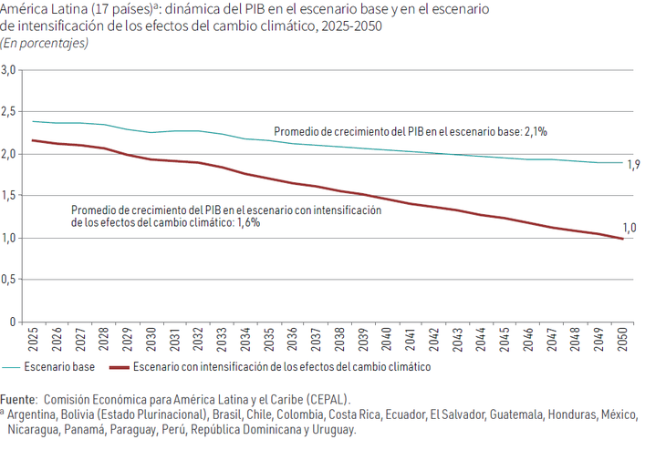 El estudio se basa en dos escenarios: el primero corresponde a uno base donde el crecimiento de la región sigue un comportamiento tendencial, mientras que el segundo refleja lo que produciría una intensificación de los efectos del cambio climático en la economía. Por otro lado, toman un período entre el año 2025 y 2050 para realizar sus estimaciones.