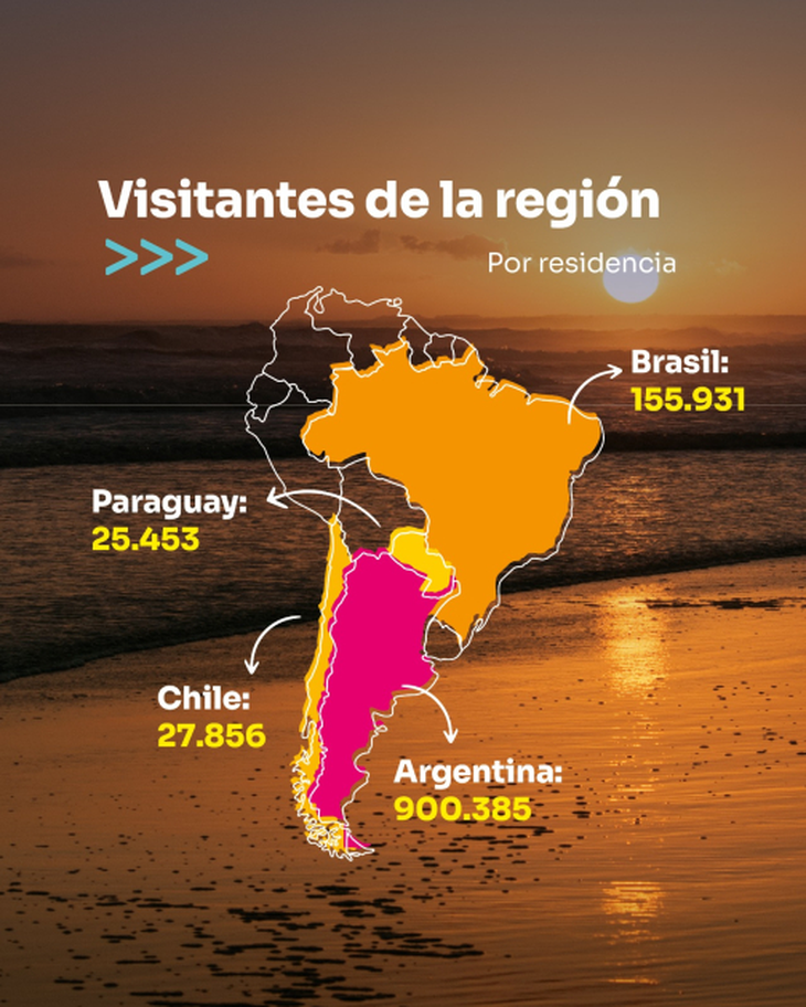El verano volvió a concentrar buena parte del flujo de visitantes, con fuerte presencia de extranjeros —en particular de Argentina— y un aporte relevante del turismo interno. Así, el principal fue el país vecino con un ingreso de 900.385 turistas al país, seguido por Brasil con 155.931. A estos les siguen Chile con 27.856 turistas y Paraguay con 25.453. Respecto al resto del mundo, Europa y Norteamérica (Estados Unidos y Canadá) los turistas que ingresaron fueron 72.354 y 53.383, respectivamente.