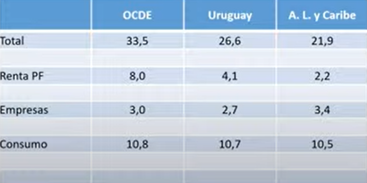 Según la Organización para la Cooperación y el Desarrollo Económicos (OCDE), Uruguay tiene una presión tributaria del 26,6%, siete puntos por debajo del promedio (33,5%) y cinco por encima de la media de la región (21,9%). “A mitad de camino”, señaló el economista Carlos Grau-Pérez, autor del informe que se expuso en el marco de la Primera Jornada de Política Fiscal y Tributaria.