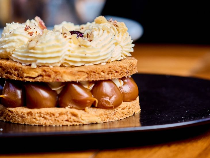 El Cheesecake ofrece una base de galletas crocantes y un toque ácido de frutillas. El Crumble de manzana se distingue por su masa dorada y su relleno tibio de manzanas especiadas, perfecto para acompañar con un café. También se lucen el Lemon Pie, con su frescura cítrica y merengue suave; el Rogel, de finas capas crocantes y dulce de leche, y la Torta Vasca, rellena con una delicada crema y mermelada casera. Cada porción es una muestra del arte pastelero francés con acento porteño.