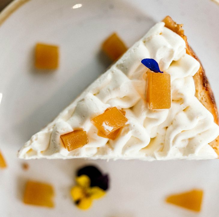 De todas, la torta cheesecake de frutos rojos es la más pedida. Su base de masa sablée horneada sostiene un relleno cremoso de queso, crema y ralladura de limón, cocido a temperatura suave hasta lograr bordes firmes y centro tierno. Se corona con una compota artesanal de frutos rojos y una flor de menta fresca, que le aporta color y aroma. Ideal para disfrutar en un espacio que invita a hacer una pausa entre historia, sabor y naturaleza.