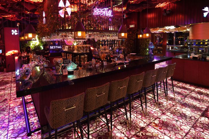 En Bestial Fly Bar, la barra se convierte en un lugar privilegiado para vivir la experiencia al máximo. Sus butacas tapizadas en animal print, amplias y con respaldo cómodo, invitan a instalarse con calma y disfrutar de la noche desde un punto estratégico. Allí mismo los comensales pueden pedir toda la carta gastronómica, que incluye entradas como croquetas, tequeños veganos o langostinos en panko; ceviches frescos, rolls de sushi y tiraditos; además de platos principales que van desde carnes como ojo de bife braseado hasta risottos, pastas artesanales, pollo al curry y opciones de mariscos.