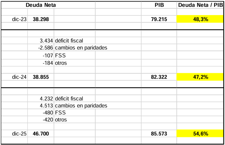 La deuda bruta del sector público total cerró en el 2025 en 64.129 millones de dólares, lo que representó un 74,9% del PIB y un aumento de 8,6 puntos respecto del cierre del 2024. La deuda neta, en tanto, fue de 46.700 millones de dólares, un 54,6% del PIB y 7,4 puntos más que el ejercicio previo.