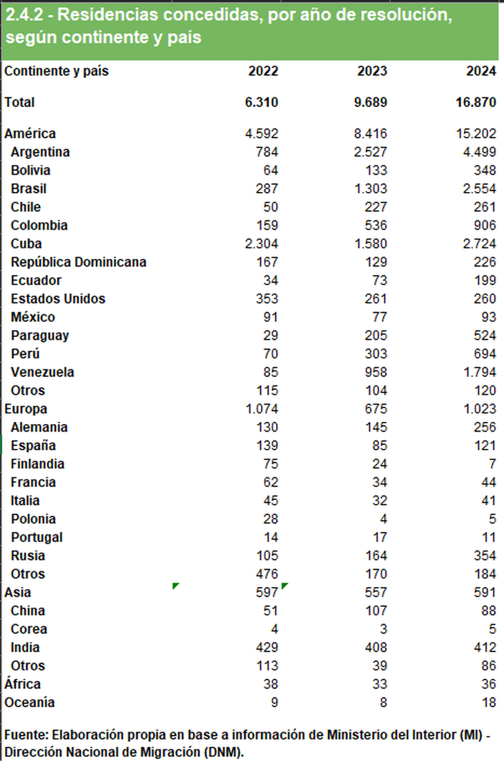 Uruguay cerró 2024 con una cifra histórica con 16.870 residencias concedidas, lo que representa un crecimiento del 74% respecto a 2023, cuando se otorgaron 9.689 residencias, y del 167% comparado con 2022, que registró 6.310 casos.