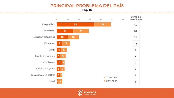 Por detrás quedaron el desempleo (29%), situación económica (20%), educación (12%), droga (9%), problemas sociales (8%), el gobierno y la actitud de la gente (7% cada uno), mientras que los políticos y la salud (ambos con 5%) cerraron el ranking.