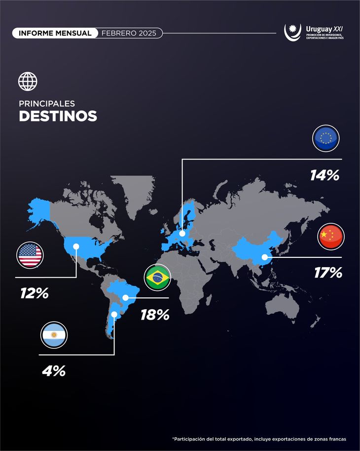 Las exportaciones a Estados Unidos y Argentina se incrementaron en febrero y fueron los únicos países del Top 5 de destinos de las colocaciones que se fortalecieron el mes pasado, según surge del último informe de comercio exterior de Uruguay XXI, lo que puede abrir las puertas a un mayor comercio con dos socios comerciales importantes.