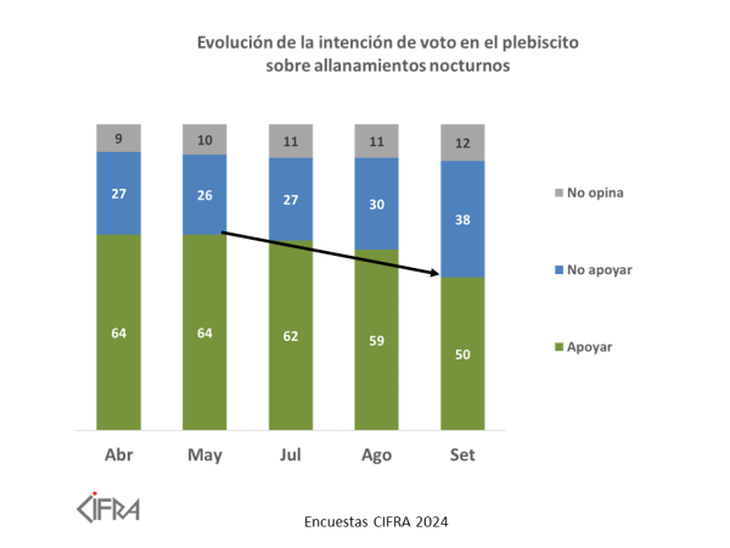 Si bien la trayectoria del plebiscito para permitir allanamientos nocturnos también es descendente, las características de esa baja, por un total de 14 puntos porcentuales, son diferentes. Hoy la intención de voto por el Sí está al límite, en el 50%, tras un brusco descenso desde el 59% que se manifestaba a favor en agosto, mientras que en julio llegaba a 62% y a 64% en mayo y abril.