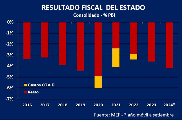 Son pronunciamientos importantes, pero requieren algo más de precisión. La regla fiscal ha sido un avance en términos de responsabilidad fiscal macro, pero hay que fortalecerla. En otro pasaje, el documento apunta a seguir reduciendo la plantilla en el Estado, no reponiendo parte de las vacantes y apuntando a la digitalización. Estiman que esto permitiría un ahorro de entre 250 y 280 millones de dólares. No es poco, pero bastante menos de los 900 millones que se planteaban en el 2019. En el actual gobierno se hicieron ahorros, pero el déficit viene cerrando en niveles similares a aquel año (gráfica). El Estado uruguayo resiste más de lo que los gobiernos de turno creen… Además, la Coalición reafirma su objetivo de eliminar la tasa consular, que recauda unos 300 millones de dólares por año. Hay fundamentos para hacerlo, pero mejorar las cuentas fiscales no es uno de ellos.