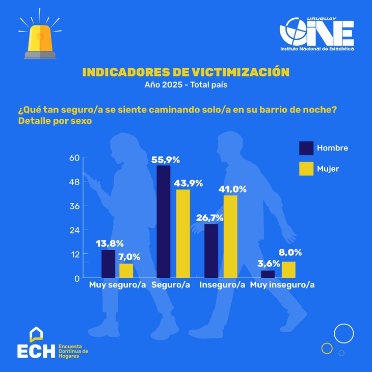 El Instituto Nacional de Estadística (INE) presentó este viernes el Informe sobre percepción de seguridad y victimización en formato anual donde establece que el 34% de los uruguayos se siente inseguro al caminar por la calle de noche, siendo las mujeres las de mayor miedo.