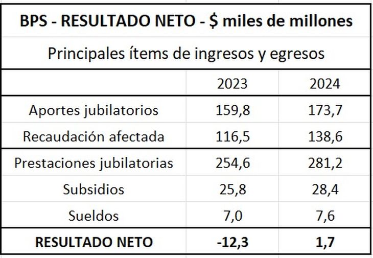 De acuerdo a los resultados auditados, el BPS pasó de un resultado neto negativo de más de 12.000 millones de pesos en 2023 a un superávit de casi 2.000 millones en 2024 (ver cuadro).