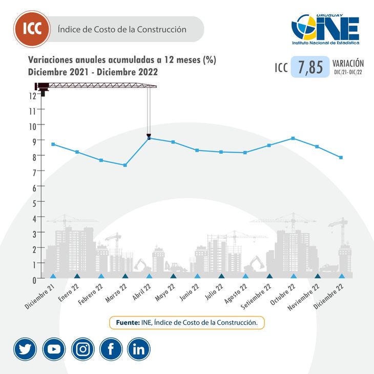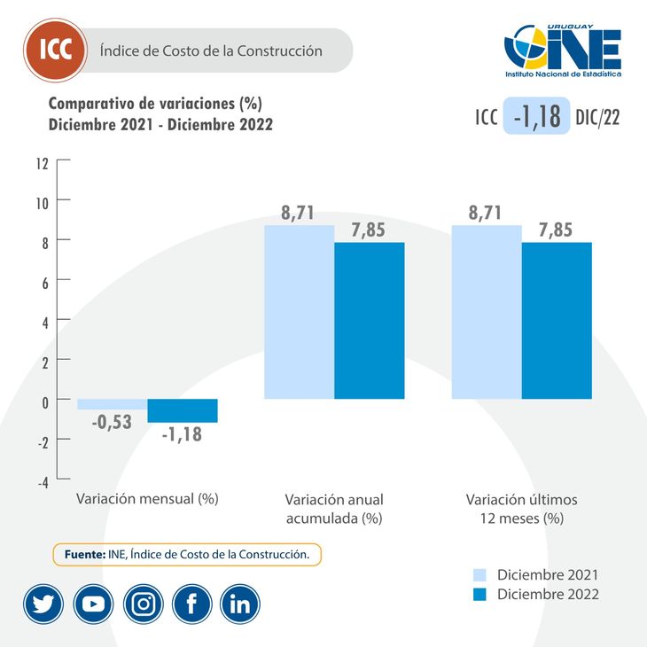 El Instituto Nacional de Estadística (INE) publicó su Índice de Costo de la Construcción (ICC) de diciembre de 2022, donde registró un retroceso del -1,18% respecto a noviembre, aunque en el acumulado del año pasado la variación fue positiva, del 7,85%.
