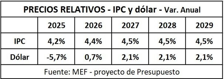 Aún con estos esfuerzos, la competitividad de la economía sigue siendo un problema y un desafío a encarar. El ministro Oddone está convencido de que eso no se arregla con cambios en los precios relativos; de lo cual se puede concluir que seguiremos con un Banco Central enfocado y vigilante en seguir bajando, y mantener baja, la inflación. En coherencia con esto, el proyecto de Presupuesto prevé que el dólar subirá, todos los años, por debajo de la inflación (cuadro). Hiper diagnosticado, el “Uruguay caro” vive y lucha.