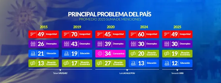 El nivel actual (49%) es idéntico al observado en 2015, al inicio del segundo mandato del expresidente de la República, Tabaré Vázquez. También se ubica por debajo del pico de 70% registrado en 2019 y es menor al 60% que marcó en 2024. En 2020, primer año del gobierno de Luis Lacalle Pou, el número había descendido a 45%. Los datos sugieren un patrón: las menciones a la inseguridad suelen incrementarse en años electorales y moderarse durante el primer año de gestión de los gobiernos entrantes.
