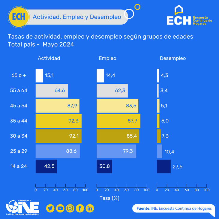 A nivel país, las tasas de actividad, empleo y desempleo se situaron en el 63,9%, 58,5% y 8,5%, respectivamente. Las mismas habían sido en el mes de abril del 64,1%, 58,3% y 9,0%, respectivamente.